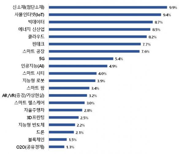 분야별로는 신소재가 9.9%, 사물인터넷 9.4%, 빅데이터 8.7% 순이다.