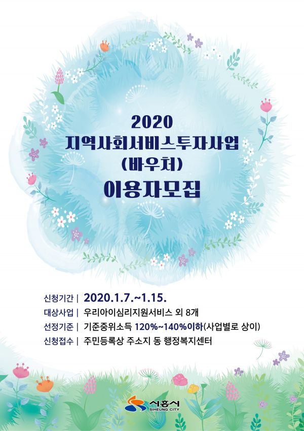 2020년 지역사회서비스투자사업 이용자 모집은 주민등록상 거주지 동 행정복지센터를 통해 접수하며 참여를 원하는 주민은 신분증과 건강보험증사본, 사업별 필요서류 등을 준비해 방문·접수하면 된다.