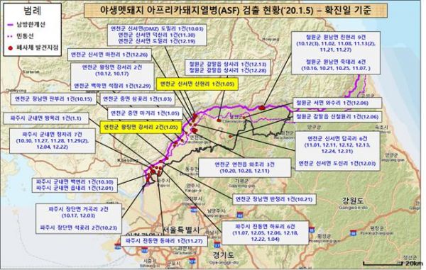 국립환경과학원은 1월 5일 각각의 폐사체에서 아프리카돼지열병 바이러스를 확진하고 결과를 관계기관에 통보했다.