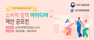 [미디어라이프(medialife)] 공정위는 소비자기본법 제정 40주년 국민참여 행사의 하나로 새로운 소비자정책을 제시하고 기존의 법·제도에 대한 개선방안을 건의하는 대국민 소비자정책 아이디어 공모전을 개최한다.