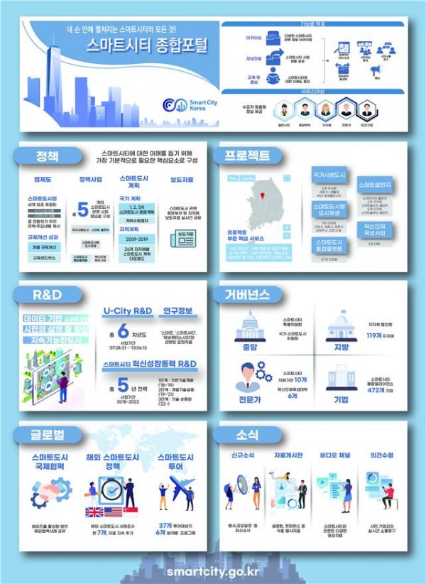 스마트시티 종합포털은 2000년대 초 유비쿼터스도시 정책을 시작으로 지난 10여년 이상 축적되어 온 스마트시티 정보들을 모두 모아 제공하는 플랫폼이자, 스마트시티와 관련된 모든 홈페이지를 연결하는 허브로서 포털 이용자들은 한 번의 클릭만으로 유관기관, 국가시범도시, 혁신성장 R&D, 솔루션마켓, 월드스마트시티엑스포 등 스마트시티 관련 누리집에 쉽게 접근할 수 있다.