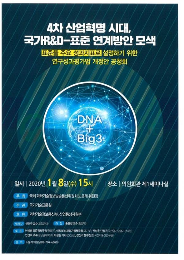 이번 공청회에서는 표준을 국가 R&D 주요 성과지표로 설정하기 위해 노웅래 위원장이 대표 발의한‘국가연구개발사업 등의 성과평가 및 성과관리에 관한 법률’일부 개정안에 대해 논의 할 예정이다.