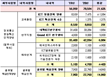 과학기술정보통신부는 ICT 석박사급 인재 양성을 위한 사업의 ’20년 예산으로 2019년 대비 약 38% 증가한 786억원을 투입하고 ’23년까지 국가 혁신성장을 견인할 핵심인재 약 6천 5백 명을 양성할 계획이라고 밝혔다.