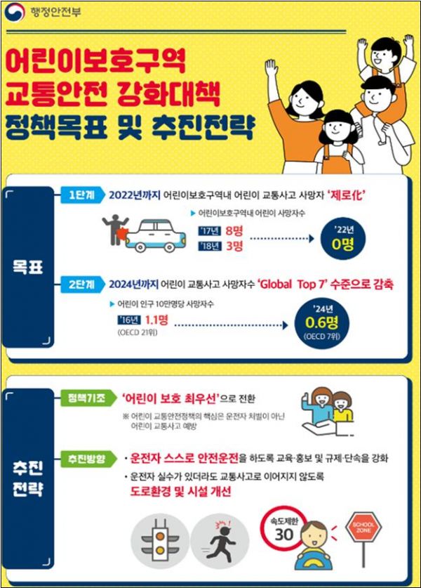 어린이 보호구역 안전시설 획기적 개선 2022년까지 전국 모든 어린이 보호구역에 무인교통단속장비와 신호등 설치를 완료할 계획이라고 전했다.