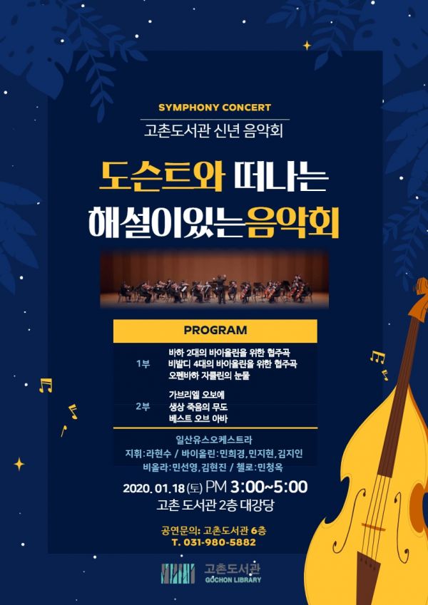 소영만 시립도서관장은 “신년음악회를 통해 고전음악을 쉽게 이해하고 도서관이 다양한 역할을 수행하는 문화의 장으로 자리매김하는 좋은 기회가 될 것으로 기대하고 있다”고 전했다.