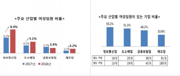 500대 기업 중 점유율이 높은 4개 산업의 여성임원 비율은 정보통신업, 도·소매업, 금융보험업, 제조업 순으로 높게 나타났다. 여성임원이 1명 이상 있는 기업 비중도 동일 순이다.