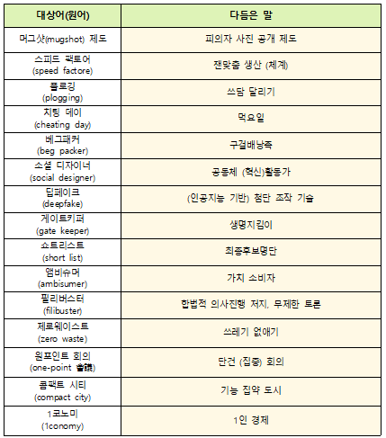 문체부와 국어원은 이처럼 의미를 바로 파악하기 쉽지 않은 용어를 언론에서 바로 포착해 쉽게 이해할 수 있도록 대체어를 마련하기 위해 새말모임을 열고 있다.