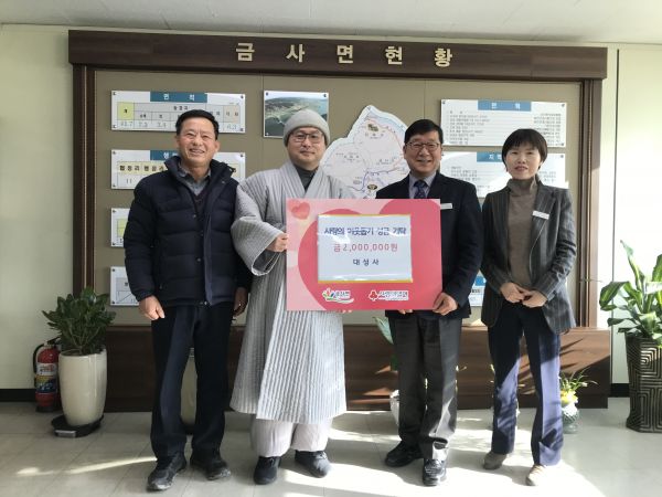 기탁식에 참석한 원각 주지스님은 “신도들과 뜻을 모아 마련한 성금이 대성사가 위치한 금사면 지역의 어려운 이웃들에게 도움이 되었으면 좋겠다”며 “지역에 자발적 기부가 지속적으로 이어지길 바란다”고 말했다.
