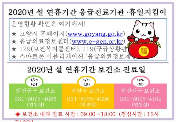 설 연휴기간 동안 보건소와 고양시민원콜센터, 구급상황관리센터, 129보건복지콜센터를 통해 문 여는 병의원과 약국 운영 여부, 구급차 출동 등에 대한 신속한 안내를 받을 수 있다.