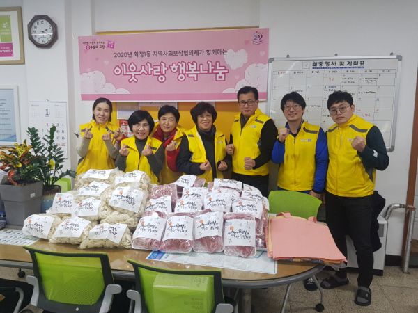 화정1동 지역사회보장협의체는 떡국떡 60kg과 소고기 60kg를 30가구에 전달했으며 복지사각지대 해소를 위해 관내 주민들이 후원한 지정기탁금으로 나눔 활동을 했다.