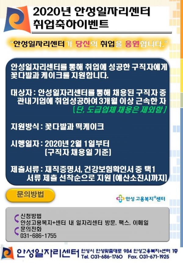 본 이벤트는 안성일자리센터를 통해 관내기업에 취업에 성공해 3개월 이상 근속하는 자에게 꽃다발과 떡케이크를 지원함으로써 구직자들의 사기진작을 위해 기획됐다.