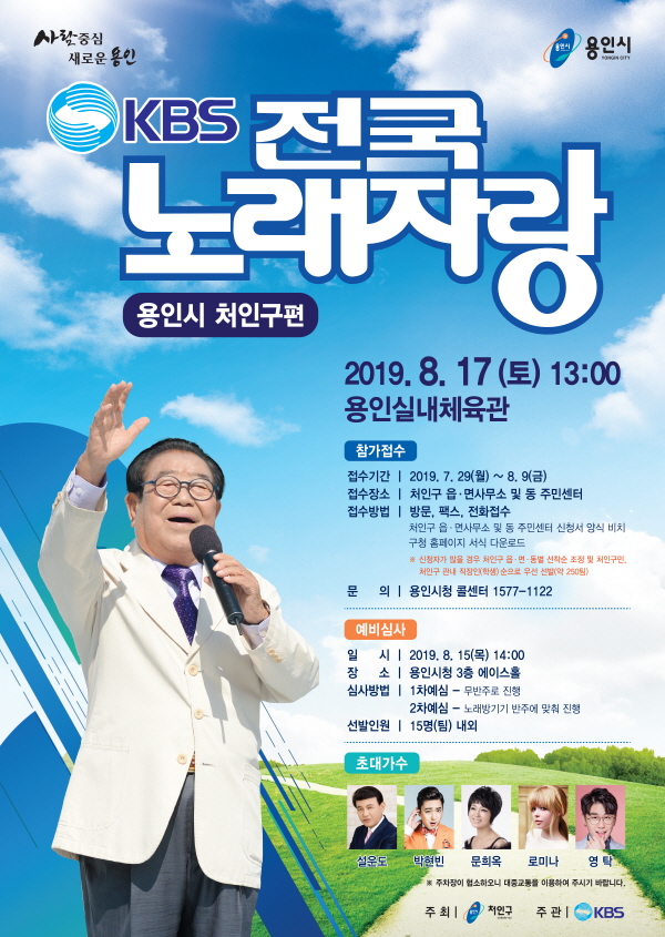 처인구 관계자는 “KBS 전국노래자랑 용인시 처인구편이 26만 처인구민에게 즐겁고 귀중한 시간이 될 것”이라며 “많은 시민들이 참여해 한마음으로 즐기는 화합의 축제가 되길 기대한다”고 말했다.