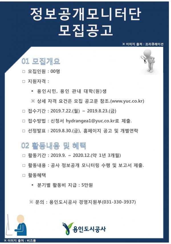정보공개모니터단과 관련한 문의는 용인도시공사 경영지원부로 하면 된다. 접수는 신청서와 증빙서류 등을 작성해 이메일로 하면 된다.