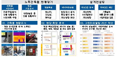 ‘노후건축물 현황평가’는 전문가 그룹이 현장 점검, 사용자 면담 등을 통해 건축물의 에너지성능, 실내 환경, 안전요소 등을 측정·분석해 건물별 맞춤형 개선방안을 제시하는 사업이고 ‘설계컨설팅’은 노후건축물 현황평가 결과에 따라 성능개선안 제시, 사업비 산출 등을 포함해 최적의 성능개선 방안을 제공하는 사업이다.