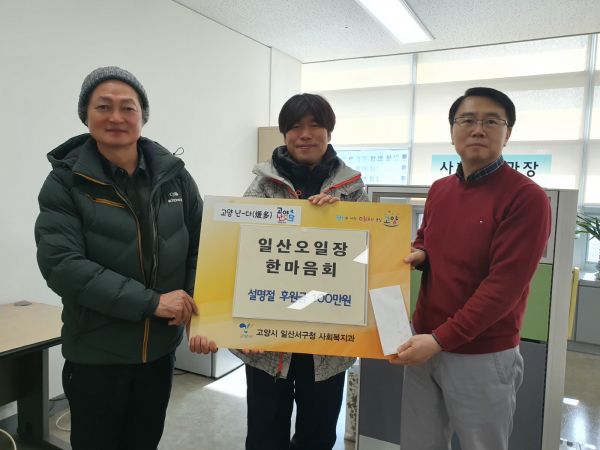일산5일장 한마음회는 20여 년간 일산5일장에서 장사를 해 온 상인들의 모임으로 2020년 설을 맞이해 지역 내 소외된 이웃들이 따뜻한 설 명절을 보내는 데 사용해 달라며 후원금 100만원을 기탁했다.