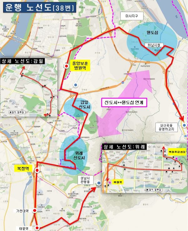 이에 시는 기존 원도심~잠실역~중앙보훈병원~위례·감일 신도시~성남 은행동을 운행되던 시내버스 30-1번을 잠실역을 경유하지 않는 경로로 변경해 38번 버스를 새롭게 운행할 계획이라고 전했다.