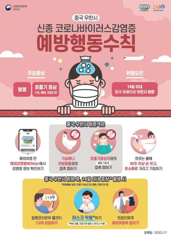 질병관리본부에서는 중국 우한시 등 위험지역을 방문한 시민 중 유사한 증상이 있으면 보건소로 바로 신고해 적절한 조치를 받도록 권고하고 있다.