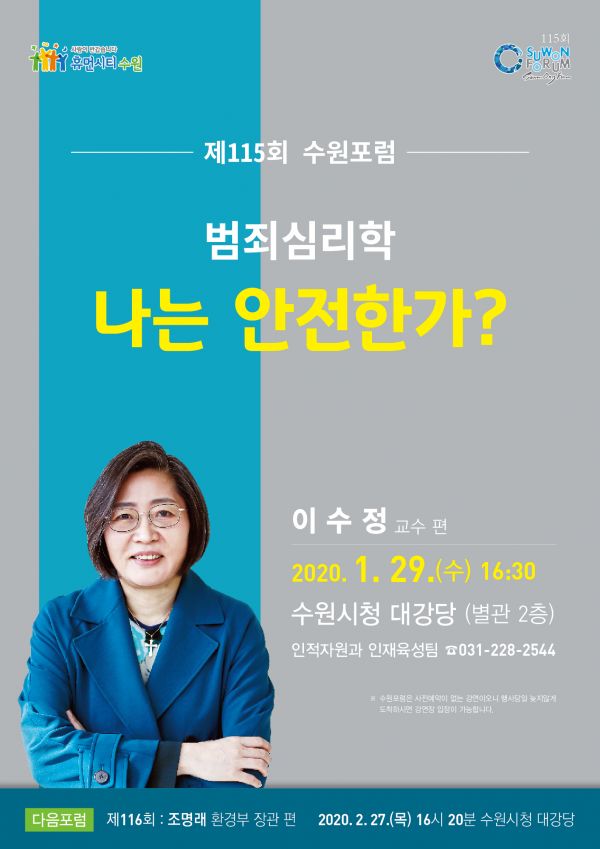 범죄 심리학자 이수정 교수가 ‘범죄심리학 ? 나는 안전한가?’를 주제로 강연한다.