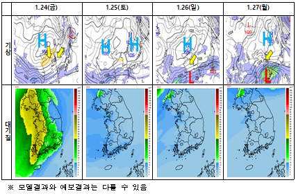 연휴 첫날인 24일은 북서 기류를 타고 유입되는 국외 미세먼지와 국내 발생 초미세먼지가 맞바람에 따른 대기정체로 축적되어 수도권·충청권·호남권 등 서쪽 지역을 중심으로 초미세먼지 농도가 ‘나쁨’을 나타내고 나머지 지역은 ‘보통’으로 전망된다.