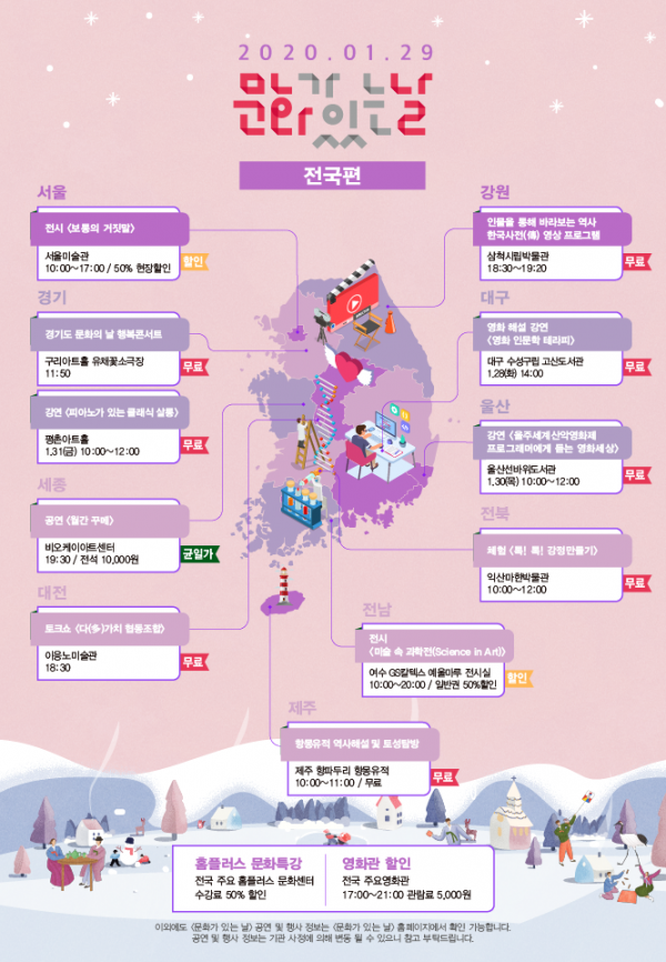 2020년에도 변함없이 문화체육관광부가 추진하는 ‘문화가 있는 날’을 통해 국민들이 일상에서 문화를 향유하고 행복을 누릴 수 있도록 영화, 공연, 전시, 박물관, 도서관, 프로스포츠 경기 등에서 무료 또는 할인 행사를 진행한다.