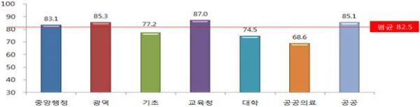 전체 기관별로는 시·도교육청의 점수가 87점으로 가장 높았고 이어 광역자치단체, 공직유관단체, 중앙행정기관 순이었다.