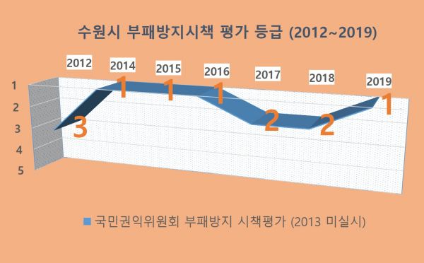 수원시는 ‘2019 부패방지시책평가’ 인구 50만명 이상 기초자치단체 부문 평가에서 100점 만점에 85.1점을 받아 1등급으로 선정됐다.