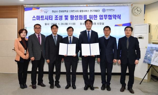 김상호 하남시장과 김갑성 연세대 스마트시티 융합서비스 연구개발단장은‘스마트시티 조성 및 활성화를 위한 업무협약식’을 지난 28일 시장실에서 개최했다.