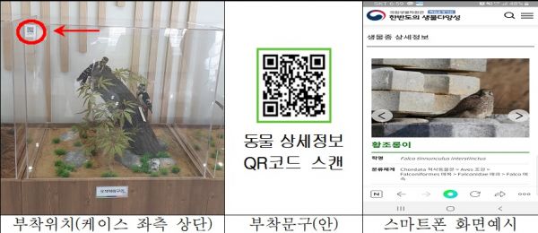 QR코드는 사각형의 가로세로 격자무늬에 다양한 정보를 담고 있는 2차원 형식의 코드로 스마트폰으로 스캔 시 야생동물 개요, 종정보, 분포지도 등 각종 정보를 제공받을 수 있다.
