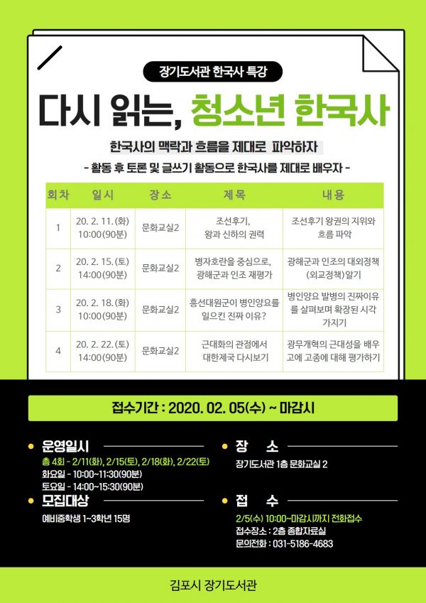 장기도서관 청소년 한국사 특강, ‘다시 읽는, 청소년 한국사’ 운영