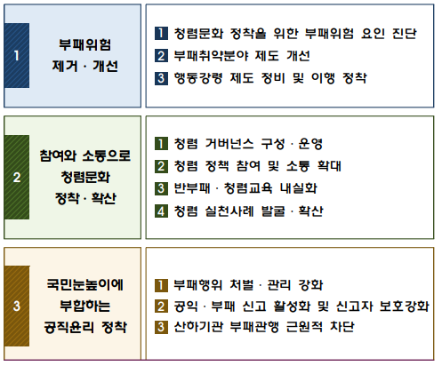 이번 대책은 간부들의 솔선을 통해 청렴리더십을 제고함으로써 전 직원의 자발적 참여를 유도하는 ‘위로부터의 청렴문화 확산’이 핵심이며 ‘부패위험 예방·개선, 참여와 소통으로 청렴문화 정착·확산, 국민눈높이에 부합하는 공직윤리 정착’ 등 3개 전략으로 추진된다.