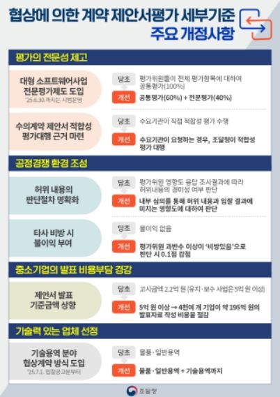 개정된 제안서 평가 세분 기준은 중소기업의 과도한 제안서 발표 비용 부담을 경감하고, 기술용역에 협상계약을 적용하는 것이 핵심이다.