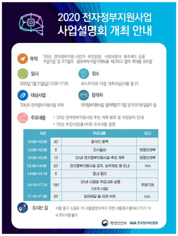 행정안전부가 오는 31일 서울 중구 포스트타워에서 ‘2020 전자정부지원사업 설명회’를 열고 올해 전자정부지원사업 추진 방향, 과제별 사업내용과 발주제도 등을 소개한다고 29일 밝혔다.