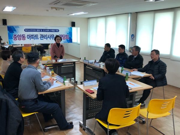 박은영 중앙동장은 ‘최근 경기불황의 장기화 등의 여파로 사업실패, 실직, 중한질병 등의 위기상황에 처한 아파트 거주세대의 복지사각지대 발생 우려가 높아졌으며 소외되고 방치되는 어려운 주민이 없도록 아파트 관리사무소의 적극적인 협조와 관심을 바란다’고 말했다.
