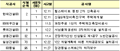 이 밖에 대우건설, 롯데건설, 쌍용건설, 일성건설, 동일의 현장에서도 각각 1명의 사고사망자가 발생하는 등 `19년 11월, 12월 두 달 동안 시공능력평가 상위 100위 중 6개 회사에서 7명의 사고사망자가 발생했다.
