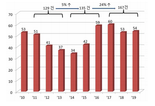 특허청에 따르면, 지난 10년 동안 석탄재 중 저회와 관련된 특허 출원 건수는 전체 484건이었는데, 최근 3년간의 연평균 출원 건수는 56건으로 직전 3년간의 45건에 비해 24% 증가했다.