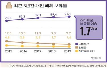 2019년 조사 결과의 주요 특징을 요약하면, 매체 이용의 개인화 확산, 스마트폰 중요도 상승 및 TV 중요도 하락, 온라인동영상제공 서비스 이용률 상승 등이다.