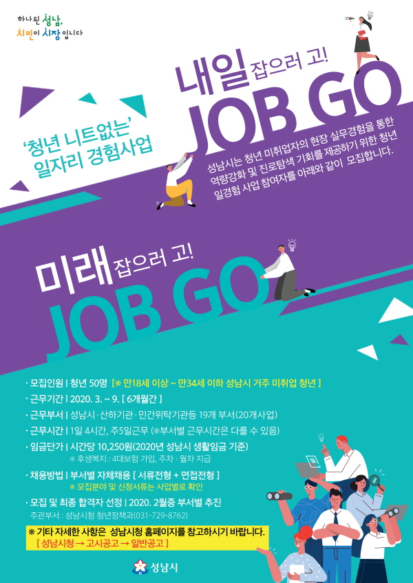 성남시 청년정책과장은 “이번 공공일자리 사업을 통해 청년들에게 민간일자리로 취업 연계를 위한 경력 쌓기의 기회를 제공하고 인력이 부족한 기관에 인력을 지원하게 될 것으로 기대한다”며 “청년 고용 창출을 위한 지속적인 청년 일 경험 사업을 추진하겠다”고 말했다.