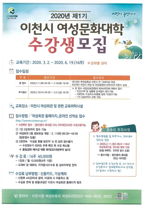 2020년 제1기 이천시 여성문화대학 수강생 모집