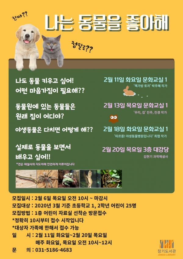 오는 2월 11일부터 20일까지 매주 화요일과 목요일 오전 10시부터 12시까지 진행되는 이번 강좌는 작가와 함께 동화책을 읽은 후, 반려동물과 야생동물을 이해하고 생명에 대한 소중함을 깨닫는 기회를 제공한다.
