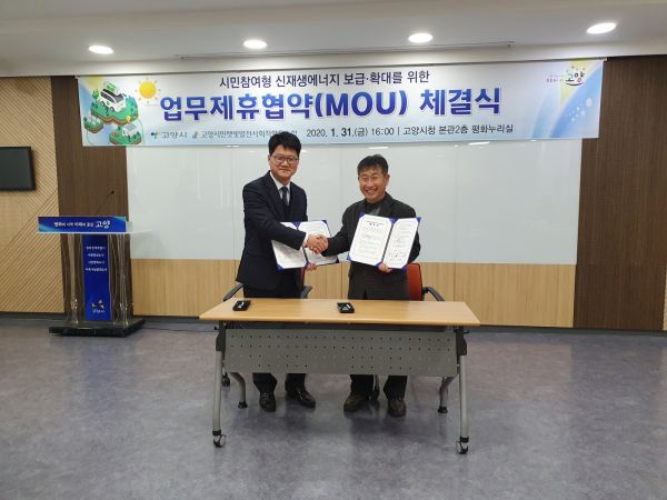 이날 협약 체결식에서 한찬희 기후환경국장과 박평수 고양시민햇빛발전사회적협동조합 이사장이 ‘시민참여형 신재쟁에너지 보급·확대를 위한 업무제휴협약서’에 서명함으로써 2030년까지 고양시 에너지자립율 20% 달성이라는 목표에 민관이 함께 협력해 실현해 나가게 됐다.