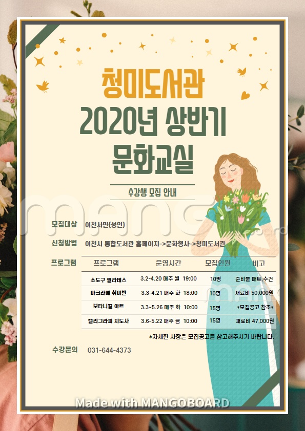 청미문화교실에 참여하고 싶은 시민들은 2월 10일부터 오전 10시부터 이천통합도서관 홈페이지에서 신청 할 수 있다.