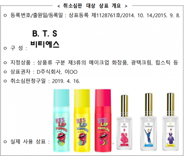 특허심판원은 “BTS”가 대한민국을 대표하는 7인조 남성 아이돌 그룹 명칭일 뿐만 아니라, ‘음반, 가수공연업, 광고모델업’ 등에 널리 인식되어 있고 ‘의류, 화장품, 핸드폰, 금융’ 등 다양한 상품의 광고모델로도 활동하고 있으며 이들 브랜드와 합작한 다양한 상품을 출시하고 있어, 일반 수요자에게 널리 알려진 상표라고 본 것이다.