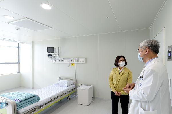 관내 국가지정 격리병상을 초과하면 감염증 환자 발생 시에 대응할 수 있도록 의은수미 성남시장이 이중의 성남시의료원장과 음압병동을 둘러보고 있다 료원 내 음압 6병상의 준비도 마친 상태다.