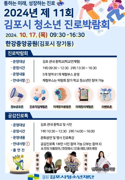 미디어라이프 중부신문 이종인 기자 | (재)김포시청소년재단 중봉청소년수련관에서는 10월17일 김포한강중앙공원에서 오전 9시30분부터 오후 4시30분까지 청소년진로박람회를 개최한다.