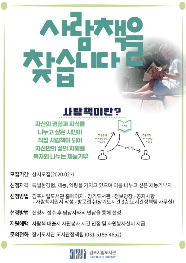 다양한 분야에서 활동하며 누군가를 격려할 수 있는 귀중한 시간을 나눌 김포시민은 김포시립도서관 홈페이지 공지사항에서 ‘사람책’ 지원신청서를 작성 후 장기도서관으로 직접 방문 신청하면 된다.