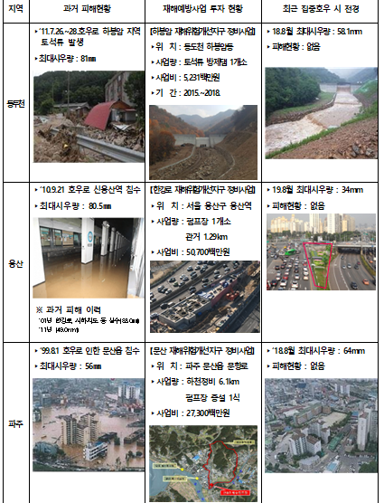 경기도 동두천 하봉암지구의 경우 2011년 7월 시간당 81㎜의 폭우로 주택이 붕괴되고 도로가 파손되는 등 심각한 피해가 발생했는데, 이후 2015년부터 52억원을 투입해 상류 사방댐 설치 및 하천 폭 확대 등 예방사업을 추진한 결과 2018년 8월 같은 규모의 폭우에도 아무런 피해가 발생하지 않아 지역 주민들로부터 상당한 호평을 받았다.