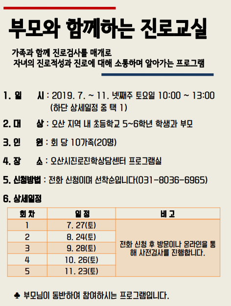 7월 27일 토요일 첫 프로그램을 시작으로 11월까지 매월 넷째주 토요일마다 진행된다. 신청은 전화로 오산시진로진학상담센터 드림웨이에서 받고 있으며, 회차별 10가족 20명으로 선착순으로 진행한다.
