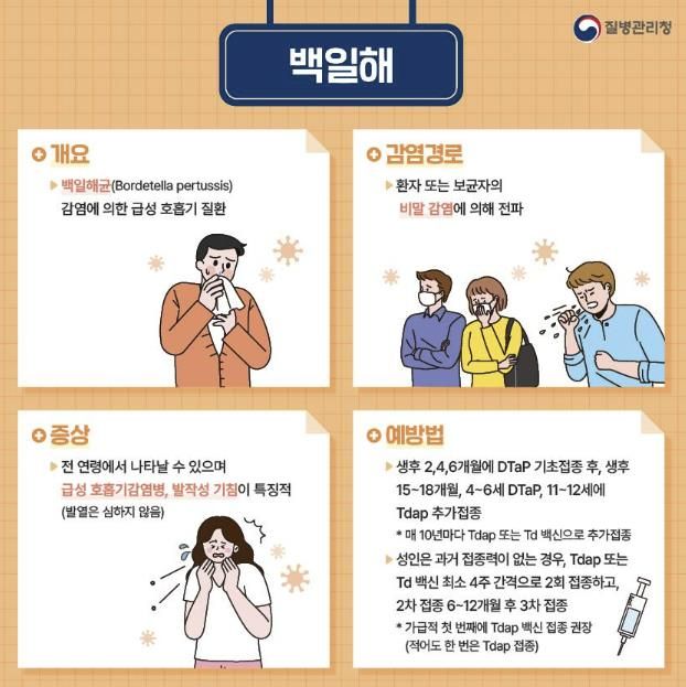 백일해는 특히 12세 이하 어린이와 13~19세 청소년에서 88.4%의 발생 비율을 보이며 초기 증상은 일반 감기와 유사하지만 2~4주간 심한 발작성 기침과 '훕' 소리를 동반한다.