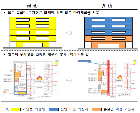 먼저, 필로티 주차장이 설치된 모든 건축물은 필로티 주차장의 외벽과 상부 1개층을 화재안전성이 강한 마감재료를 사용해야 하여, 필로티 주차장에서 발생한 화재가 건축물 외벽을 통해 상부층으로 확산되는 것을 방지하도록 했다.