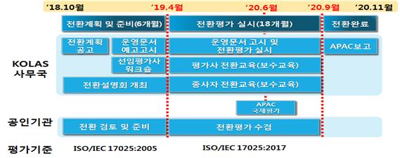 이에, 한국인정기구를 총괄하는 국가기술표준원은 2018년 10월 'KOLAS 기관 전환 추진단'을 구성하여, 해설서 제작, 공인기관 대상 설명회, 평가사 교육 등의 사전 준비를 마치고 2019년 4월부터 한국인정기구 794개 공인기관의 운영체계 전환을 위한 대장정에 돌입했다.
